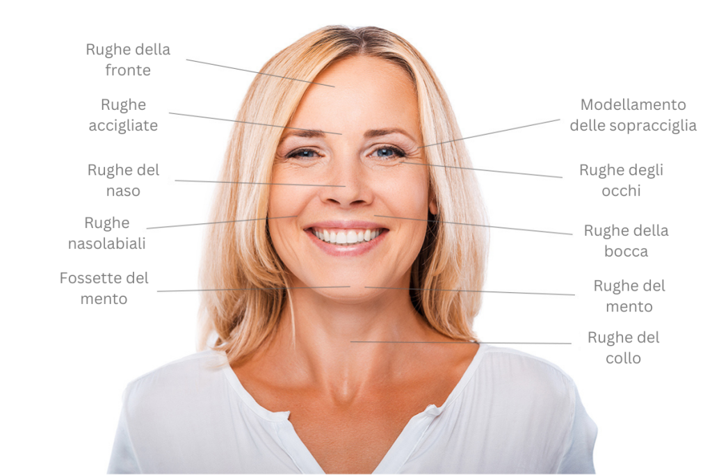 Le zone di utilizzo più comuni sono le pieghe naso-labiali (dalla radice del naso all’angolo delle labbra), le rughe glabellari (tra le sopracciglia), le rughe intorno alla bocca e agli occhi, ma può essere utilizzato anche per altre zone.
